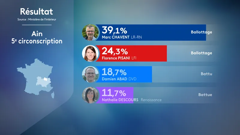 Lyes LOUFFOK, Nouveau Front populaire, 33.03% qualifié⋅e Lyes LOUFFOK UG – Nouveau Front populaire 33.03 % 19 974 votes Sylvain BERRIOS, Divers droite, 27.97% qualifié⋅e Sylvain BERRIOS DVD – Divers droite 27.97 % 16 916 votes Frédéric DESCROZAILLE, Ensemble, 18.57% qualifié⋅e Frédéric DESCROZAILLE ENS – Ensemble 18.57 % 11 232 votes Anne-Gaëlle SABOURIN, Rassemblement national, 18.36% qualifié⋅e Anne-Gaëlle …